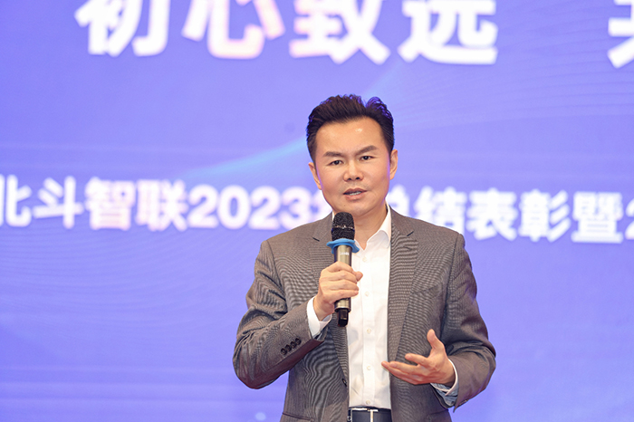 北斗智联董事长花伟程作大会发言。他回顾了北斗智联2023年经历的挑战与变革,充分肯定了公司取得的丰硕成果,并代表董事会向坚守一线、辛勤付出的全体员工表示衷心感谢。他对公司管理干部及员工提出两大要求:第一,摒弃本位主义,高效协同;第二,履职尽责,勇于担当。同时,他也指明2024年北斗智联发展的三大方向:首先是坚定不移地开拓市场;其次是坚定不移地实施低成本、高效率运营;最后是坚定不移地拥抱变革,时刻保持危机感。